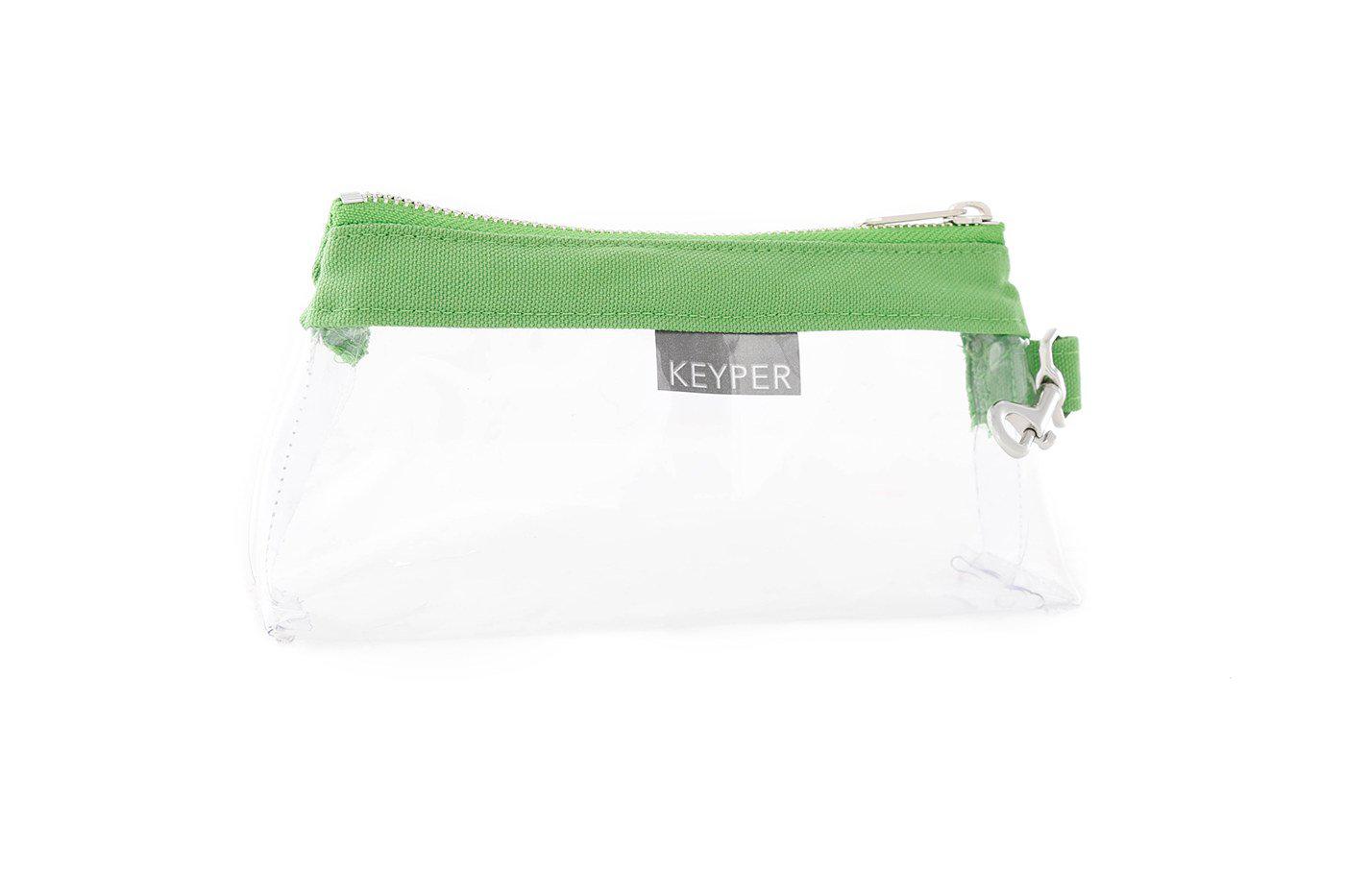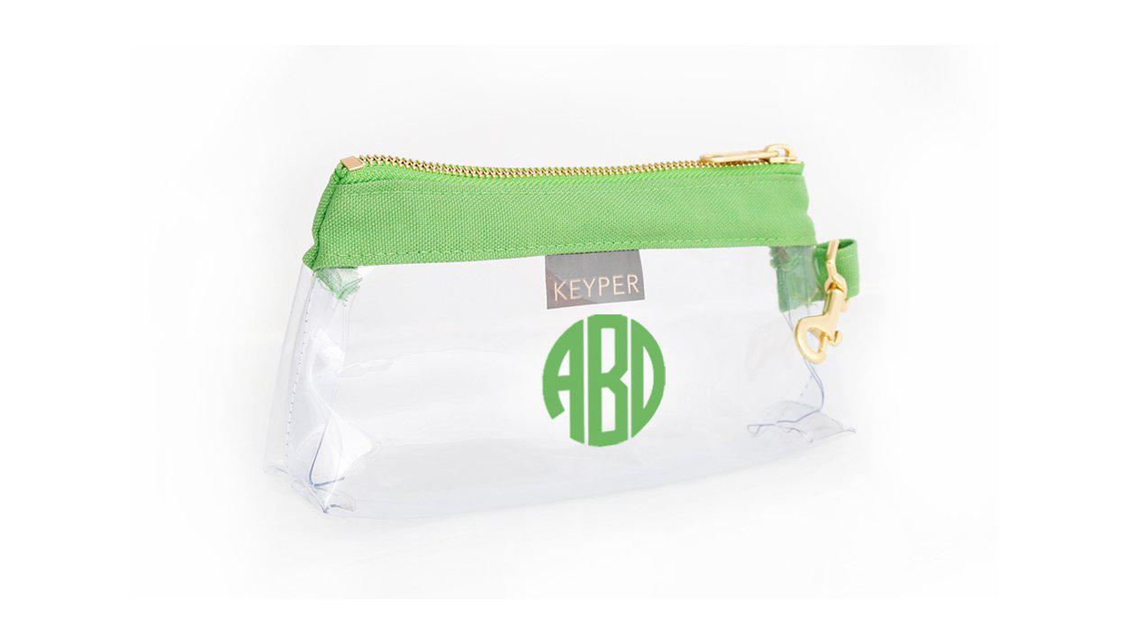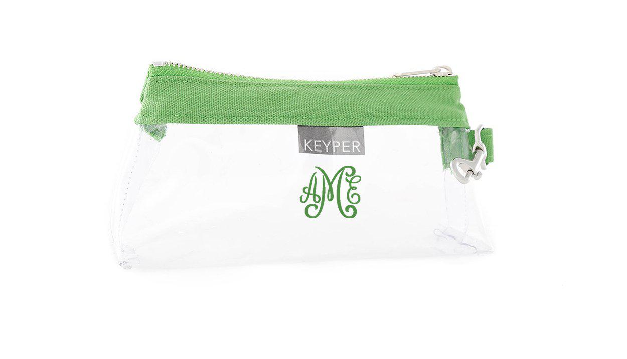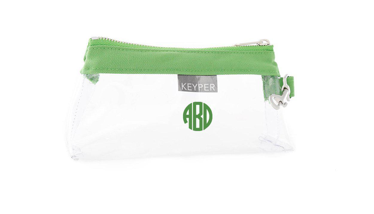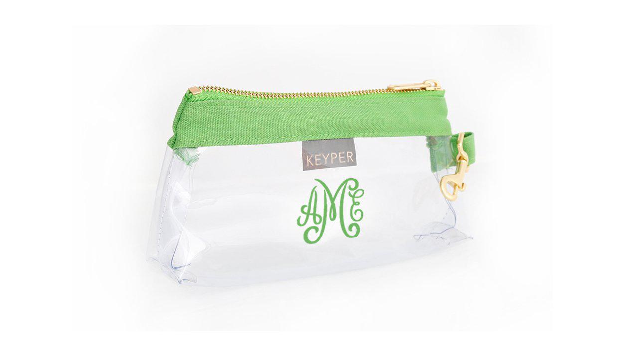 The Monogrammed CLEAR Bag clips to the KEYPER® Key Ring Wristlet and can be used as a stand-alone clutch or purse organizer. The Clear Bag boasts an A-Line design that allows extra room for all phone sizes, inhaler, EpiPen, sunglasses and more.