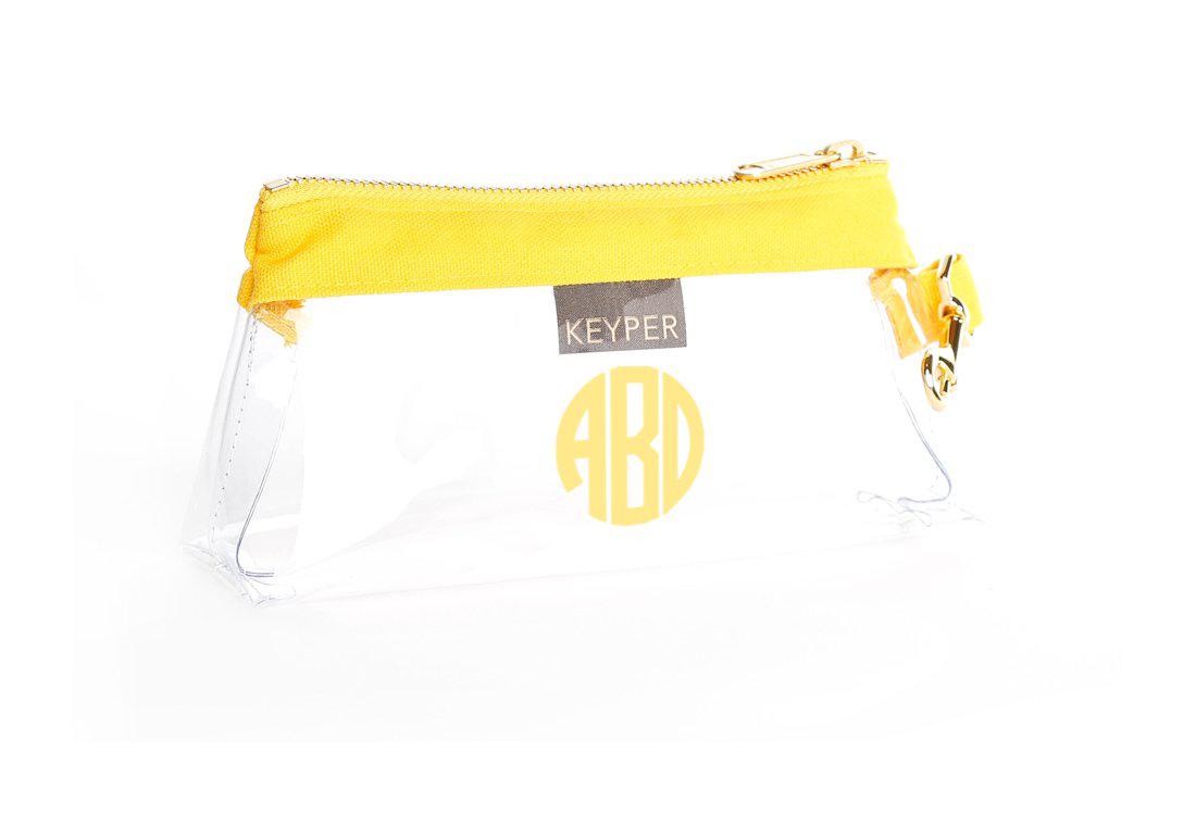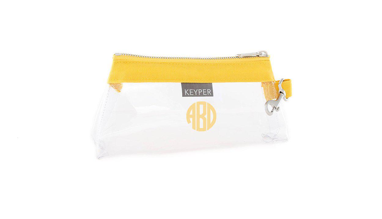 The Monogrammed CLEAR Bag clips to the KEYPER® Key Ring Wristlet and can be used as a stand-alone clutch or purse organizer. The Clear Bag boasts an A-Line design that allows extra room for all phone sizes, inhaler, EpiPen, sunglasses and more.